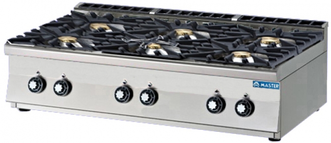 Piani di Cottura INOX a Gas da Banco – Serie 900 N. 6 Fuochi (1×4,0KW + 3×7,0KW + 2x10KW) KW 45,000 Dimensioni : 120x90x28 cm